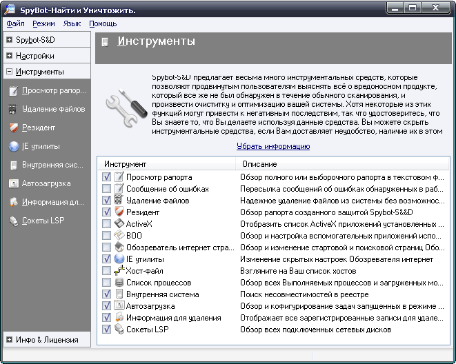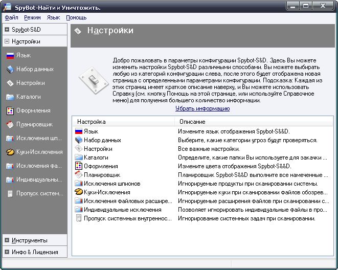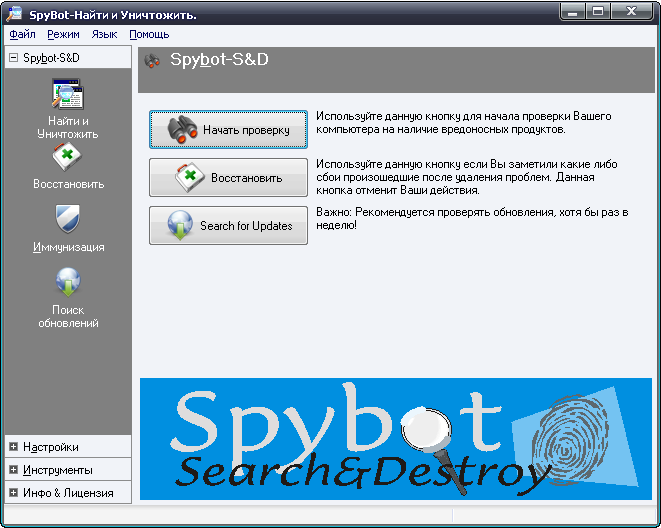 Программа Spybot Search and Destroy производит поиск на жестком диске вашего компьютера так называемых шпионских (Spyware) и рекламных (Adware) модулей. Adware несут ответственность за отображение нежелательных рекламных объявлений, а Spyware передают Вашу конфиденциальную информацию, включая информацию о поведении в Интернете. Одной из интересных особенностей Spybot - Search and Destroy является удаление информации Вашего пребывания в Интернет, что предотвращает передачу таковой владельцам Spyware. Еще одна особенность Spybot Search and Destroy - совместимость с другими программами, список которых постоянно обновляется. Также можно отметить высокий профессионализм Safer Networking Limited, ее команда своевременно выпускают обновления как программы, так и базы вредоносных программ. <СКАЧАТЬ> | |